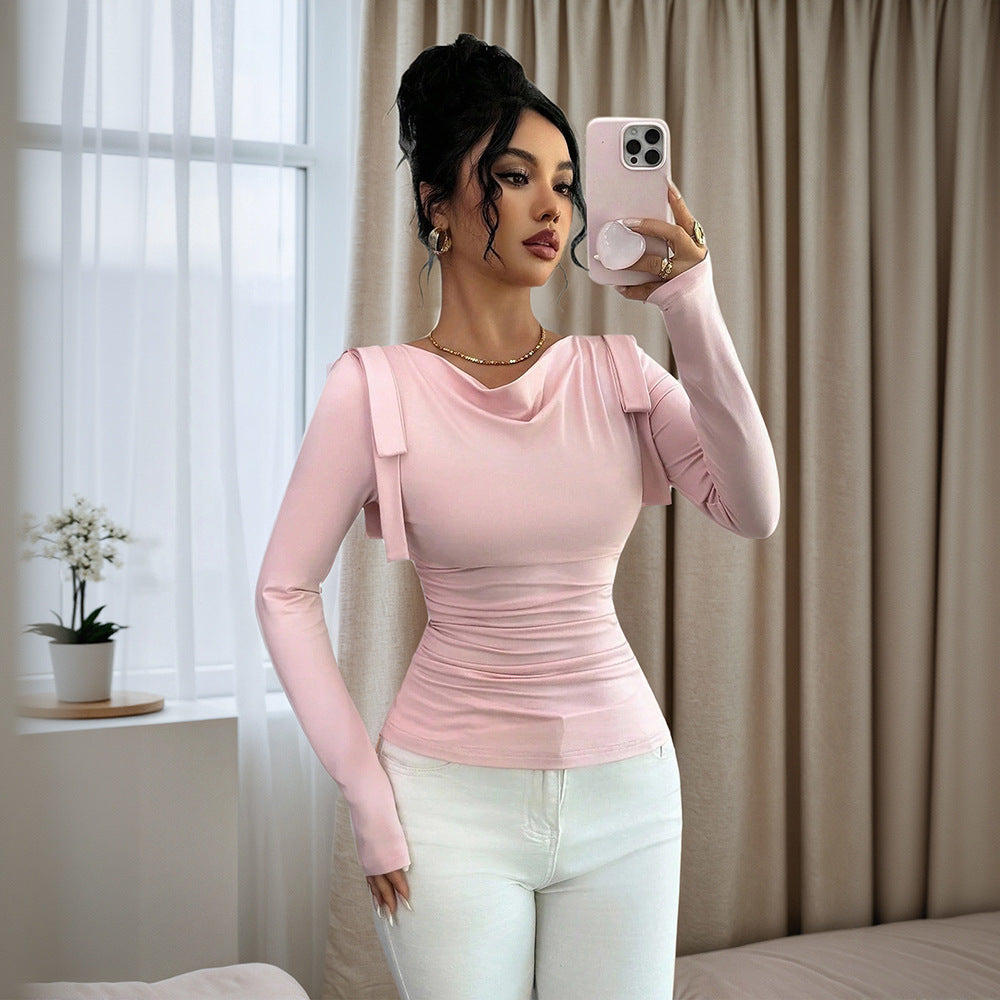Designed as a versatile wardrobe essential, this slim-fit long sleeve top features a refined pile collar that adds subtle structure and elegance. The solid color design creates a clean, all-matching look, while the body-contouring fit delivers a slimming effect. Perfect as a bottoming shirt for spring and autumn, it layers effortlessly under blazers, coats, or knits while remaining polished on its own.