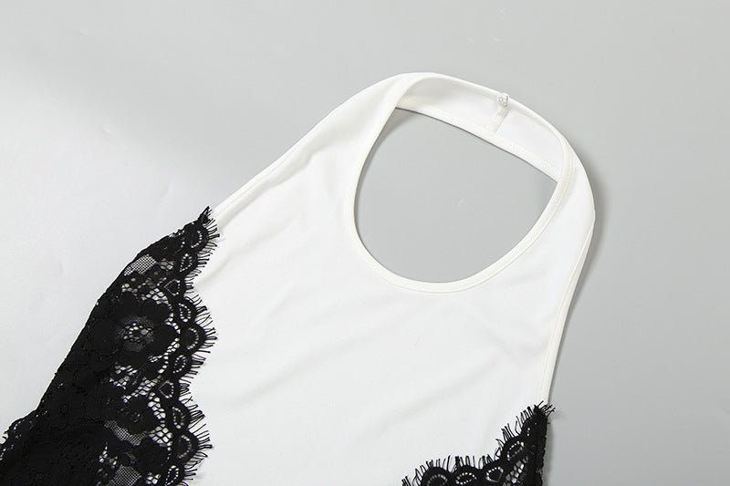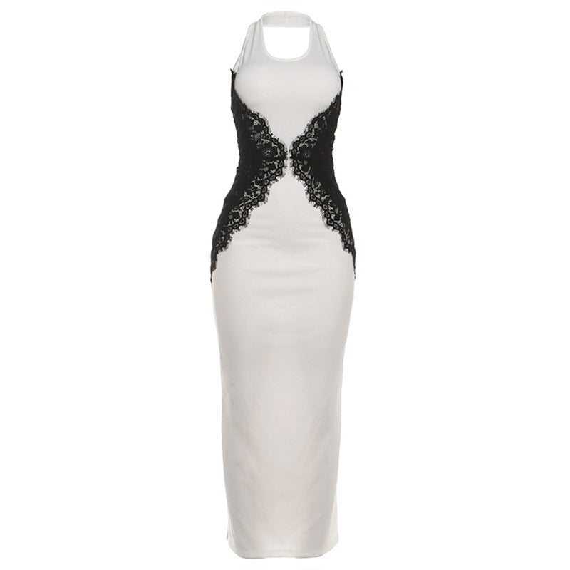 Bold yet refined, this slim-fit halter maxi dress is designed to sculpt and captivate. Featuring contrast color blocking with lace and mesh patchwork, it creates a striking visual balance between elegance and allure. The backless cut and subtle hollow-out detailing enhance the silhouette, while a sleek side split adds movement and sensuality. Finished with a concealed zipper for a smooth fit, this dress transitions effortlessly from elevated daytime wear to evening moments.