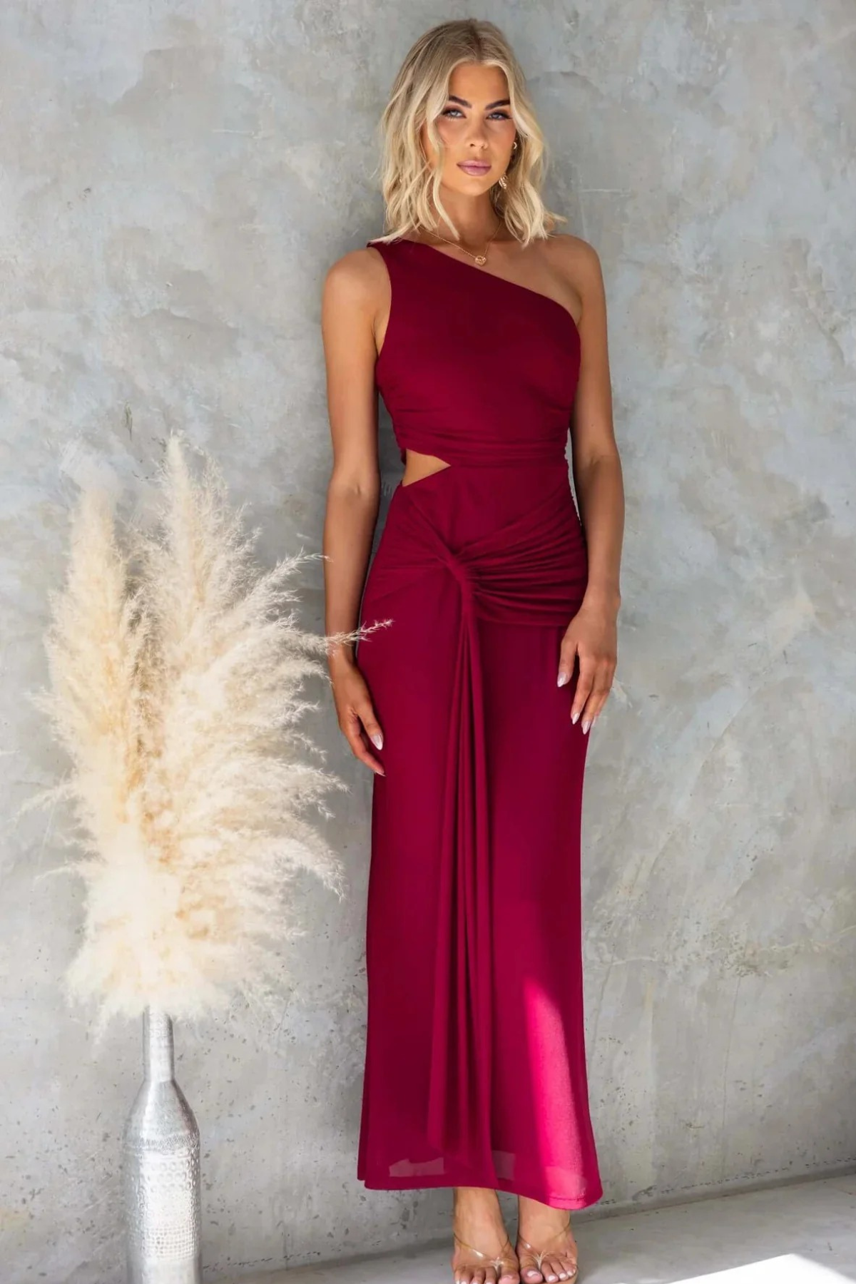 Design: This elegant and sultry one-shoulder maxi dress is defined by its striking asymmetry and intricate cutouts. Featuring ruched detailing, a twisted bodice, and a body-hugging silhouette, it flatters the figure while exuding sophistication. The side zipper ensures a clean, secure fit—perfect for formal events and special occasions.