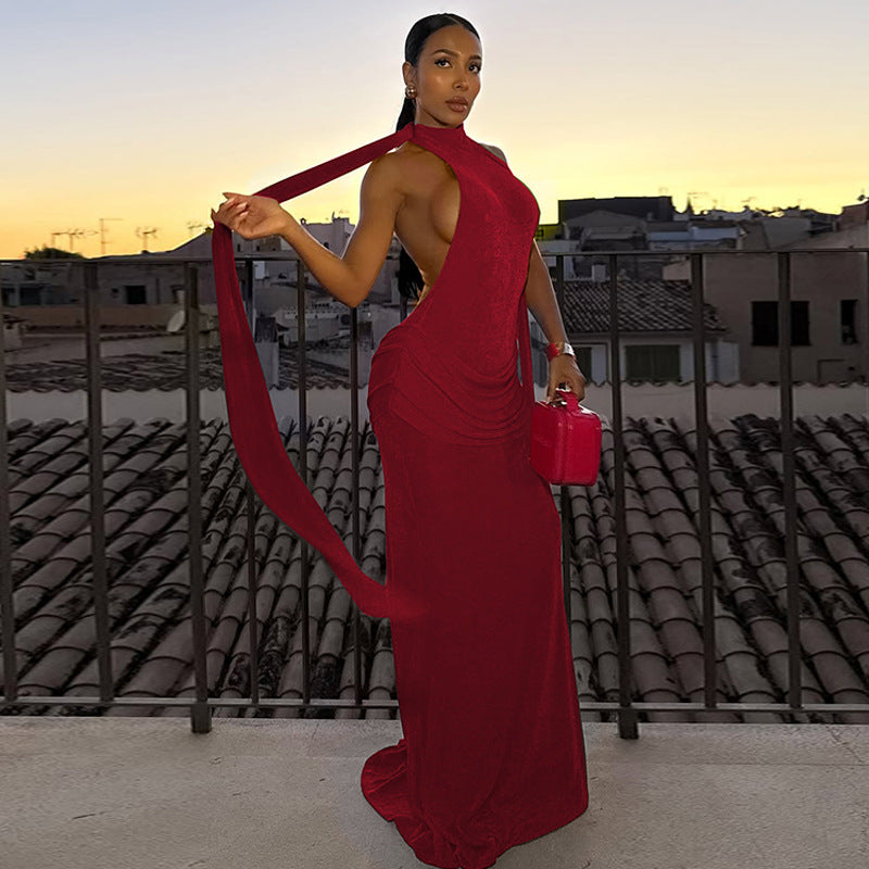 Designed to captivate, this slim-fit evening dress features a halter neckline that frames the shoulders beautifully and a striking open-back design for a bold, feminine finish. Soft pleating adds texture and fluid movement, while the solid color keeps the look timeless and refined. Perfect for formal evenings, events, or elevated nights out.