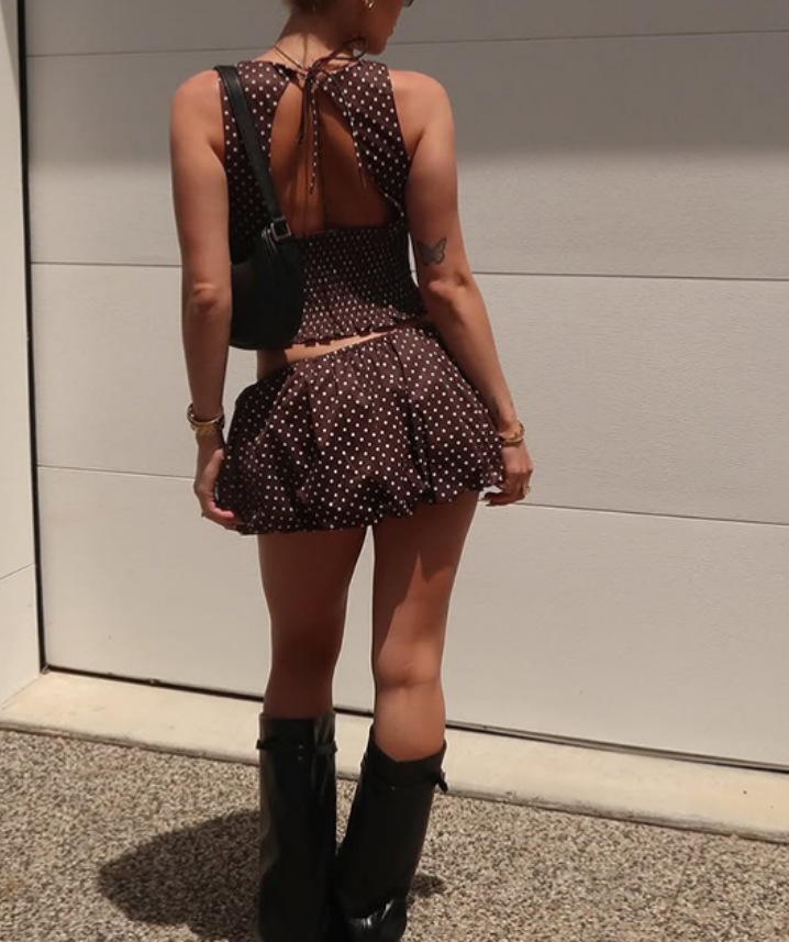 Playful yet sultry, this two-piece set features a smocked crop top with delicate tie accents, ruffle trims, and a charming crew neckline. The low-rise mini skirt matches in a breezy polka dot pattern, complete with a flirty cutout and backless detail for a daring summer vibe. Perfect for sunny getaways, rooftop brunches, or festival days.